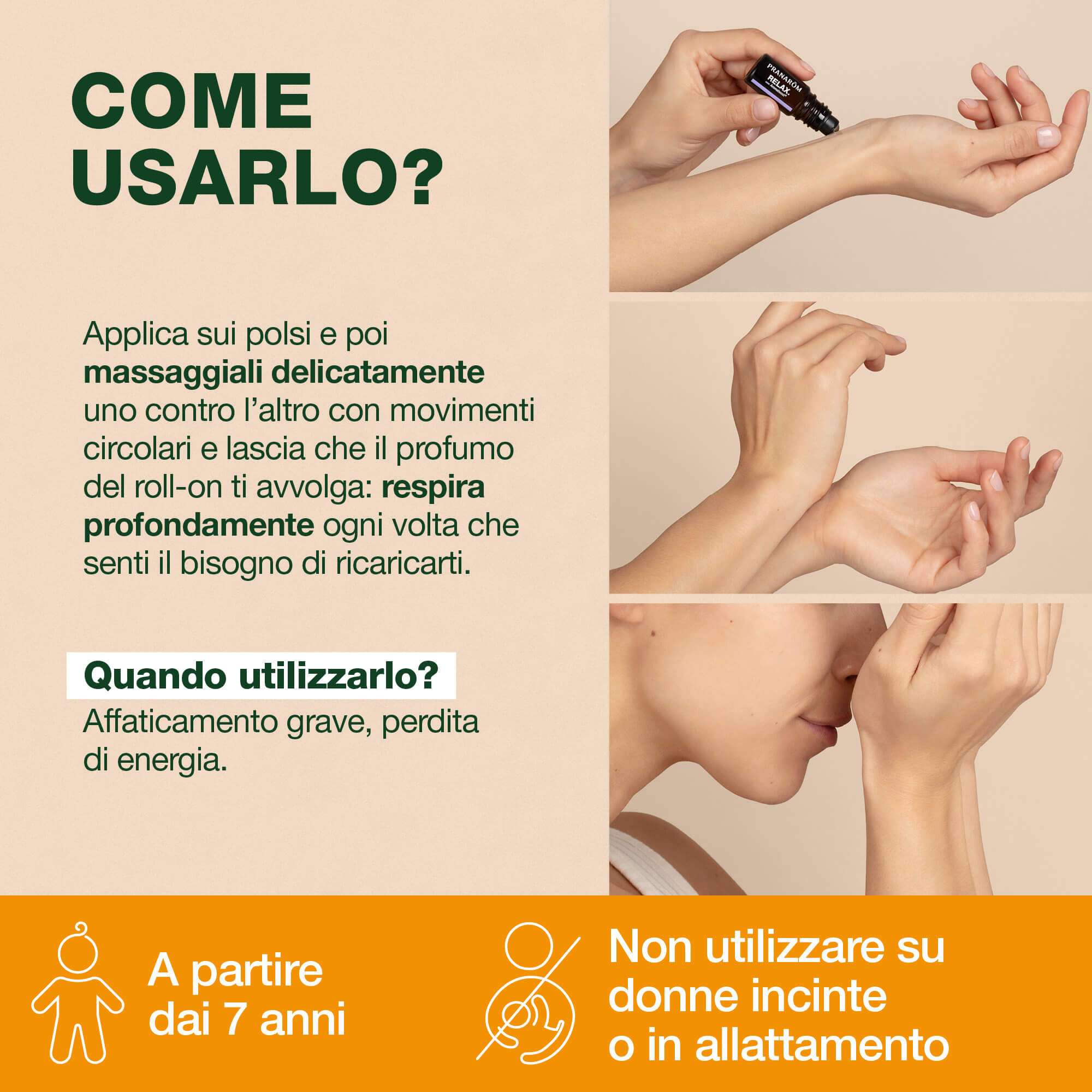 Applicare con 2 movimenti circolari all’interno dei polsi, strofinarli uno contro l’altro e respirare profondamente ogni volta che se ne avverte la necessità.