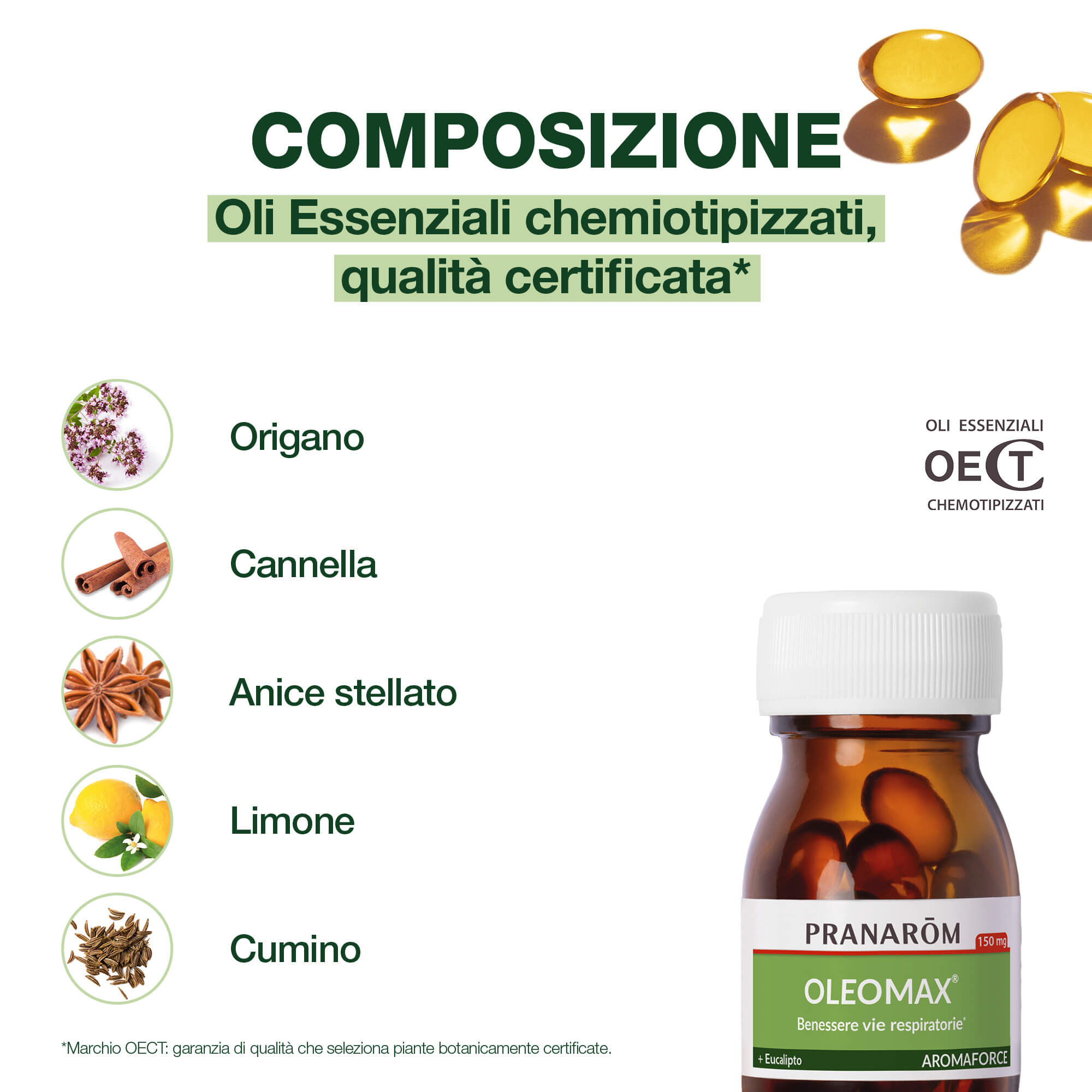 Olio di Semi di Girasole* (Helianthus annuus); Gelatina; Gelificante: sorbitolo; Olio essenziale di Origano vulgare* (Origanum vulgare - 135 mg), di Eucalipto radiato* (Eucalyptus radiata - 120 mg) e di Cannella di Cina* (Cinnamomum cassia - 90 mg); Gelificante: Glicerolo; Acqua; Oli essenziali di Pino silvestre* (Pinus sylvestris - 60 mg); Gelificante: Pectina; Olio essenziale di Limone zeste* (Citrus limon - 45 mg); Antiossidante: estratto ricco in tocoféroli.