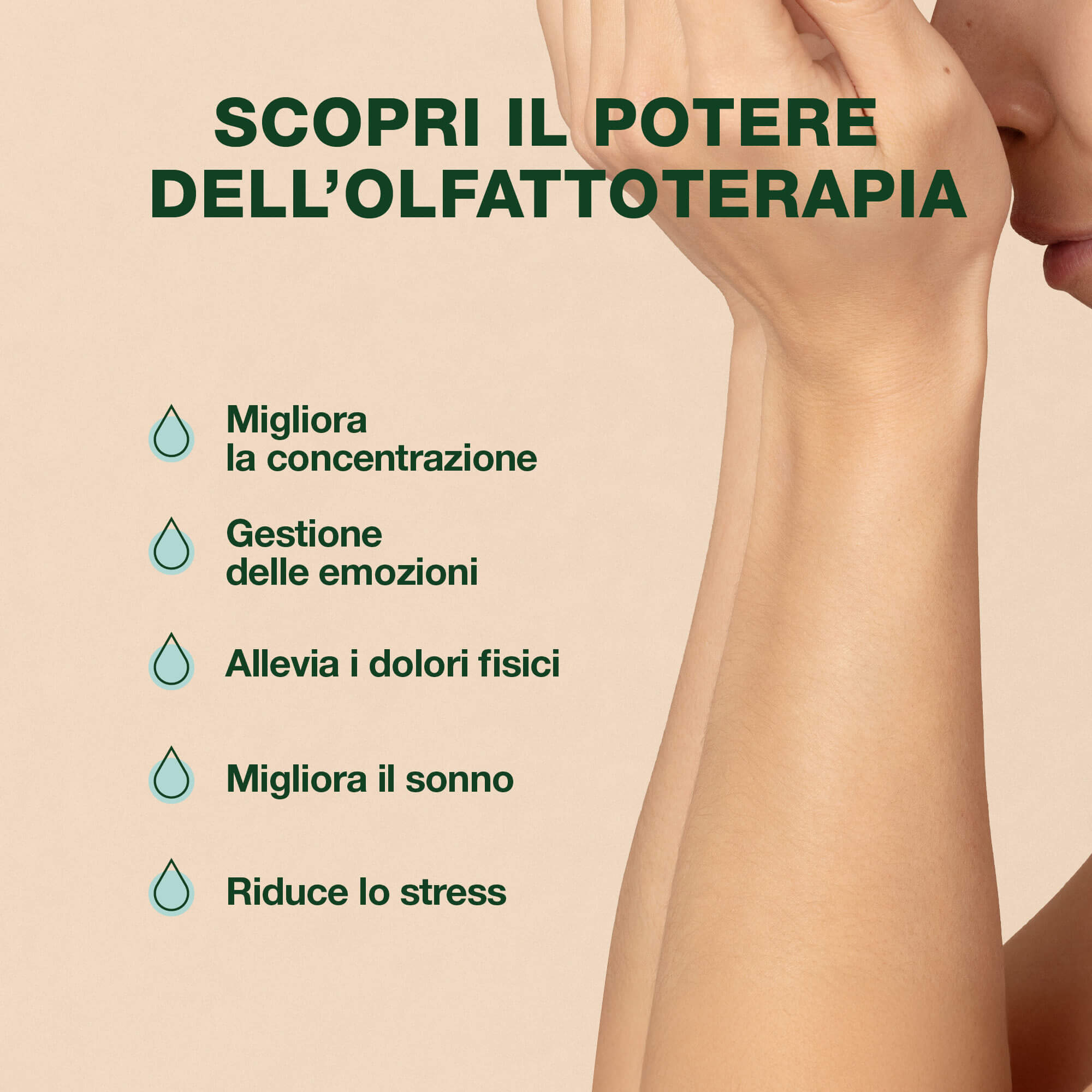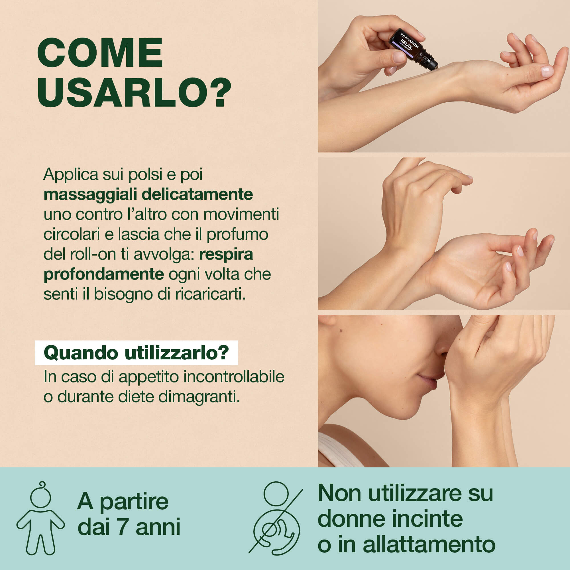 Applicare con 2 movimenti circolari all’interno dei polsi, strofinarli uno contro l’altro e respirare profondamente ogni volta che se ne avverte la necessità.