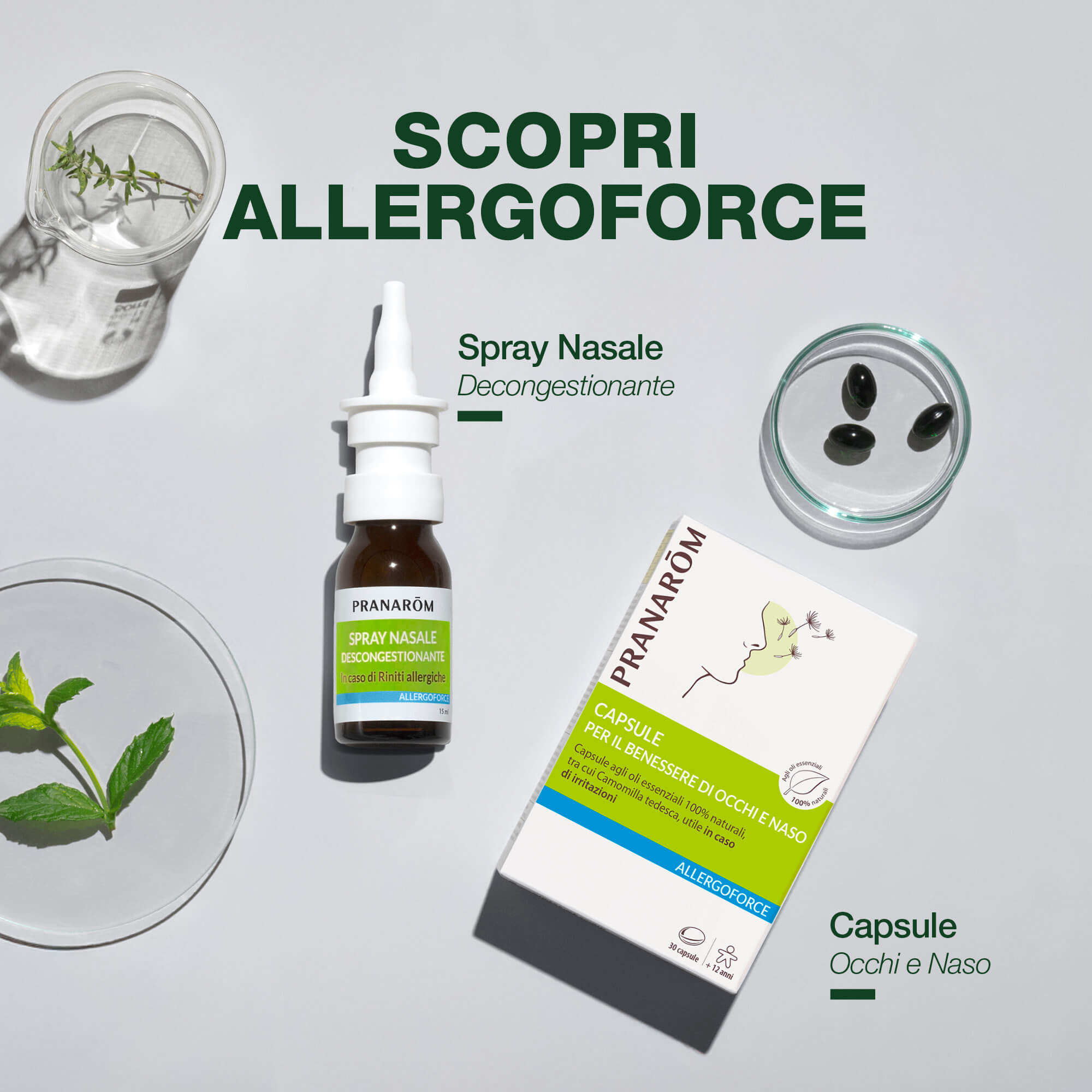 "- Lo spray nasale Allergoforce è una soluzione ipertonica con aggiunta di oli essenziali e biologici al 100%. Gli oli essenziali di Tanaceto annuo, Camomilla selvatica, Camomilla romana e Peppe nero sono noti per le loro proprietà depurative, rinfrescanti ed emollienti.\n- Questo prodotto è indicato per il trattamento sintomatico della congestione nasale, per esempio in caso di rinite e rinofaringite. Decongestiona e libera le vie nasali eliminando il muco, che causa la contaminazione batterica, senza disidratare le mucose. Procura una sensazione di freschezza grazie alla presenza degli oli essenziali.\n\nAllergoforce spray nasale non provoca assuefazione. \n\nErogatore spray : Sicurezza rinforzata - chiusura inviolabile, filtrazione dell’aria entrante.\n"